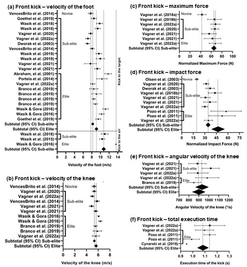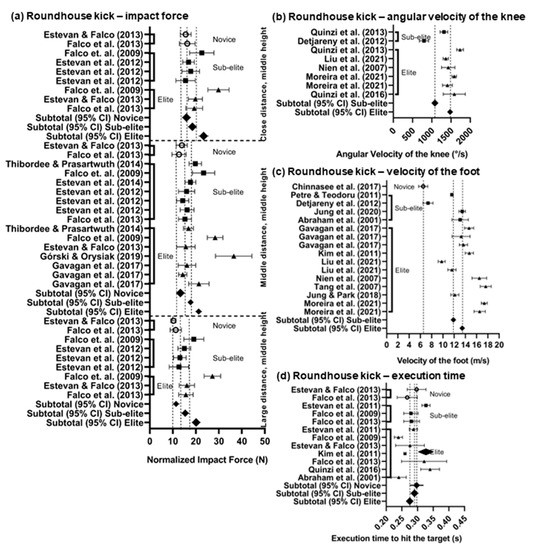 3.1. Forest Plots of Front and Roundhouse Kicks