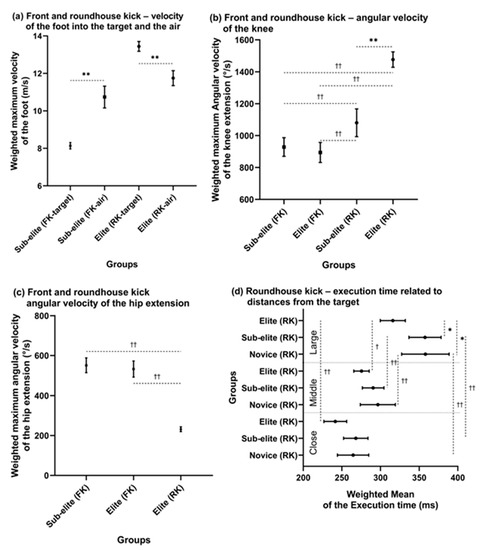 - Gavagan, C.J.; Sayers, M.G.L.A. Biomechanical Analysis of the Roundhouse Kicking Technique of Expert Practitioners: A Comparison between the Martial Arts Disciplines of Muay Thai, Karate, and Taekwondo. PLoS ONE 2017, 12, e0182645. [Google Scholar] [CrossRef]