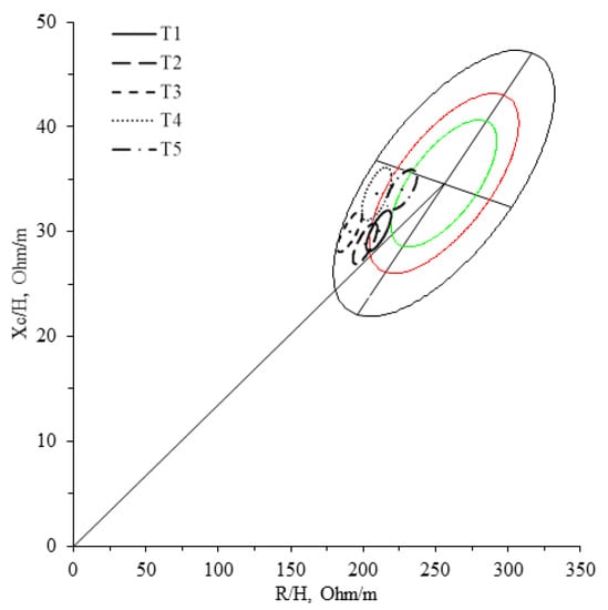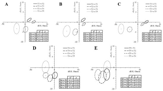 | R/H (Ω/m) | 204.6 ± 18.4 b,c,e | 195.2 ± 18.3 a,c,d,e | 185.0 ± 18.9 a,b,d,e | 205.0 ± 23.0 b,c,e | 224.3 ± 24.6 a,b,c,d | 0.003 |