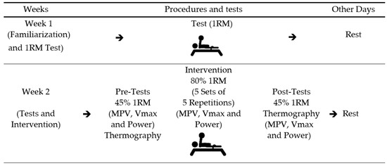 This study is a crossover design, where each participant acted as their own control. The study was carried out over two weeks. In the first week, participants engaged in a familiarization session and a bench press one-repetition maximum (1 RM) test. In the second week, athletes performed four repetitions at 45% of 1 RM followed by a conventional Paralympic powerlifting training of five sets of five repetitions (5 × 5). After that, athletes repeated the four repetitions at 45% of 1 RM. Linear encoders and surface thermography were used to estimate dynamic force parameters (mean propulsive velocity, maximum velocity, and power) and skin temperature (infrared thermography), respectively. Force parameters and skin temperature data were assessed for the dominant and non-dominant arm [30,31], as shown in Figure 1.