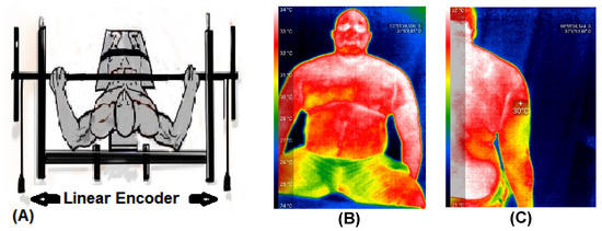 Thermographic images were obtained using a Seek Thermal Compact Pro thermal camera (Seek Thermal, Moscow, Russia). This camera has a resolution of 320 × 240 pixels and operates in a temperature range between −4 and 330 °C at distances between 0.91 m and 5.48 m. The images were collected from the clavicular region of the major pectoralis and long head of the triceps brachii [14,36]. Figure 2 displays the two linear encoders (Figure 2A) and the thermographic images (Figure 2B,C). The linear encoders (Vitruve Force Measurement System, Mostoles, Madrid, Spain) [33,37] accurately measured vertical displacement velocity [38]. These encoders were used to determine maximum velocity (Vmax), mean propulsive velocity (MPV), and power.