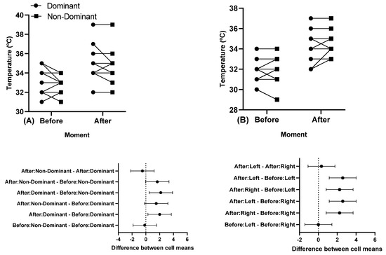 Regarding skin temperature, our study found no asymmetry either before or after the training session. However, there was an increase in skin temperature in dominant and non-dominant limbs between before and after the training session. Studies suggested that physical exercise promotes a muscular inflammatory state, which is associated with an increase in local temperature, remaining elevated for ~24–48 h or more, depending on the workout intensity [39,46]. This temperature increase is normal, as long as it is within a pattern of values, where larger differences have a greater impact and a higher risk of injury [16]. However, it has been observed that infrared thermographic images demonstrate high sensitivity in relation to possible physiological changes in the muscle, especially in the 24 h after training [15]. Another study presented results where the muscle temperature would decrease during the first minute (between the beginning and the end of the first exercise series). And yet, at the end of the third series, there was an increase in the local temperature of approximately 8.4% compared to the initial temperature. A difference of 6.6% was also observed in relation to the control. Thus, skin temperature in high-intensity exercise would decrease in the initial phase, and then continuously increase until muscle fatigue [47]. In the same direction, it was observed that the skin temperature behavior would vary according to the type of exercise, intensity, duration, muscle mass, and subcutaneous fat layer. The kinetics of skin temperature were evaluated on the worked musculature and other body segments during and after exercise, according to the type and intensity of exercise. The temperature behavior was observed during exercise, immediately afterward, and up to 48 h after exercise, in different types and intensities of exercise. Skin temperature in active muscles increased during high-intensity anaerobic exercise, slowly decreased after exercise, and increased again in the days after training. Contrary to this, the local temperature decreased during low-intensity aerobic exercise, returning to normal values a few minutes later and showing a slight increase in the following days [10].