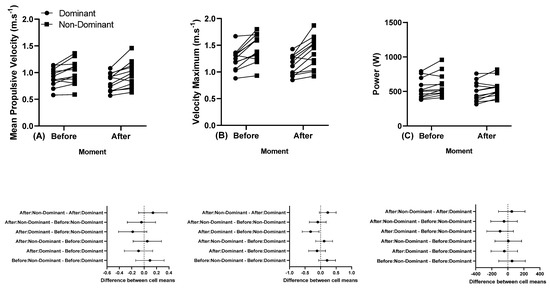 (A) Individual mean propulsive velocity, (B) individual maximum velocity, and (C) individual power, and below in the same column is the 95% confidence interval of the dominant and non-dominant arm before and after the first and last series of the 5 × 5 performed at 80% 1 RM. Note: some athletes presented similar results; thus, all 12 participants’ data are not visible in the (A–C).