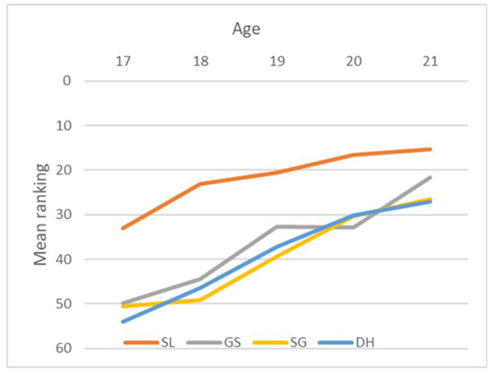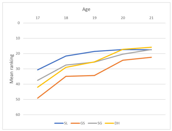 Increase in mean ranking across age category and events in male skiers. A lower ranking indicates better performance. (SL = slalom; GS = Giant slalom; SG = Super G; DH = downhill).