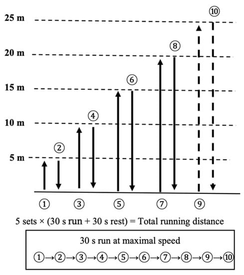 In our study, players underwent a high-intensity exercise protocol, running back and forth at maximum speed for 30 s at various distances, including 5 m, 10 m, 15 m, 20 m, and 25 m. The exercise routine consisted of 5 sets, with each set separated by 30 s of rest (as shown in