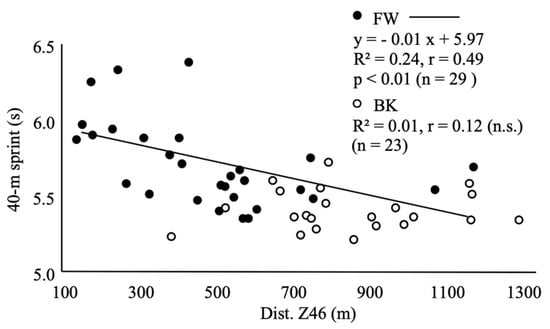 Moreover, our analysis revealed a significant correlation between Dist. Z46 and RSA (r = 0.54), indicating that players with greater Dist. Z46 scores tend to exhibit better repeated sprint ability. Additionally, we observed an intriguing anti-correlation between Dist. Z46 and the 40 m sprint time (r = −0.49). This suggests that FW players, similar to BK players, must possess not only high sprinting abilities but also substantial endurance capacity, which becomes crucial for executing repeated sprints and covering longer total running distances at high intensity during a match.
