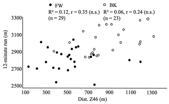 Regarding each physical fitness test, Dist. Z46 was found to correlate highly with RSA. However, no correlations were found for the 12 min run or 40 m sprint. These results suggest that high Dist. Z46 revealed the excellent capacity to repeat sprints (i.e., RSA) in BKs. In addition, no correlation was found between Dist. Z46 and elevated blood lactate after the RSA. The average change in blood lactate after the RSA test was 16.1 ± 3.5 mmol/L. The RSA test involves repetitive sprint exercises that depend on glycolytic metabolic capacity. Therefore, the proportion of blood lactate after the RSA test was expected to increase in the subjects with better RSA. However, no correlations were found in the changes in blood lactate and with 40 m sprint, RSA, Dist. Z46, or Max. speed. It is speculated that the lactate increases during sprinting and decreases during active recovery [