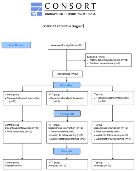 Inclusion criteria for the participants were: (1) Healthy, 12–14 years of age, and (2) not participating in an organized sporting activity. Furthermore, none of the participants were on any prescribed medication and were able to cope with the strain of the experimental procedure. All participants and their parents declared their consent both orally and in writing after they were informed about the investigation process. Four participants dropped out because they could not follow the training (2 in VTT and 2 in IT), 6 participants developed lack of interest towards training (2 in VTT and 4 in IT) and 20 participants stopped training due to time constraints (6 in VTT and 4 in IT). No injuries were reported during the training period. The procedures followed were in full agreement with the Declaration of Helsinki of 1975, as it was revised in 2000, while an approval by the Ethics Committee of the University was provided (protocol number 505).