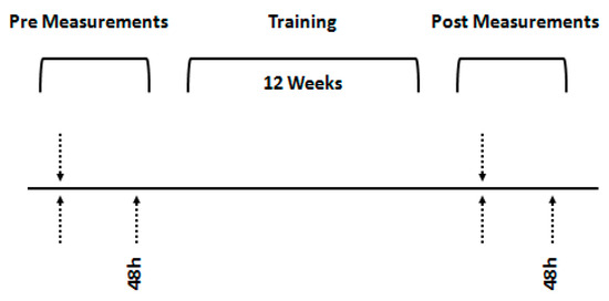 Participants visited the laboratory two times prior to the training intervention. During the first visit, the anthropometric characteristics and their biological age was recorded using the Tanner method, an echocardiographic study was conducted, their maximal oxygen uptake (VO2max) was measured and their ventilatory threshold (VT) was determined. During the second visit, the time in velocity at VO2max (vVO2max) until exhaustion (Tlim) was determined. Measurements were obtained with a difference of at least 48 h. The same procedures were followed after the training intervention. Participants were instructed to refrain from participation in physical activity or exercise 48 h before the measurements. The research design is shown in Figure 2.
