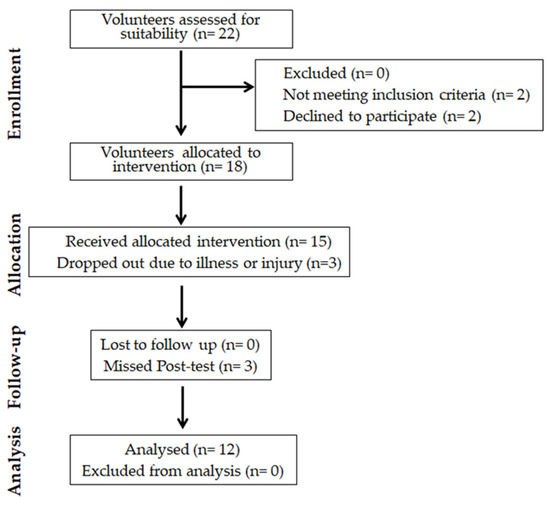 Sample size was calculated with a power analysis (G*Power V 3.1.9.6), and this indicated that seven participants were required. The calculation was based on a medium effect size (Cohen’s d = 0.50) for COD with an alpha level of 0.05, statistical power of 80%, one group with 5 measurements, for repeated measures, within subject analysis of variance (ANOVA). However, in an effort to enhance the study’s robustness and account for potential attrition, we ultimately recruited a slightly larger sample of participants, totaling 22. Twenty-two elite U-17 male soccer players voluntarily participated in the study. Four participants were excluded due to specific reasons: two were affected by musculoskeletal injuries, while two others declined participation for personal reasons. Ultimately, twelve male soccer players (age: 16.3 ± 0.3 years, height: 1.81 ± 0.10 m, body mass: 67.7 ± 7.2 kg) successfully completed all stretching protocols and performance assessments (Figure 1). Players were included when they voluntarily agreed to participate (by providing written consent) and were already registered with the soccer club. Players were excluded from this study if they were suffering from any current musculoskeletal injury, neuromuscular disorders, or any medical condition. All subjects played in a second national championship soccer division (Olympic Oued Ellil) team, had over eight years of soccer training experience, and actively participated in official games throughout the season. They trained sessions for 4 to 5 days a week (~90 min per session), and playing one game over the weekend.