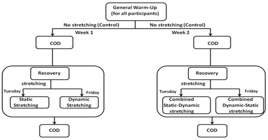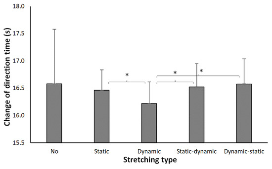 Regarding combined stretching (combined static–dynamic stretching or combined dynamic–static stretching), our results showed that there were no significant differences between the two protocols and between the combined stretching and static stretching or no stretching conditions. In addition, COD performances were significantly better after dynamic stretching than after both the combined stretching protocols. It seems that the combination of static stretching and dynamic stretching may have counterbalanced the possible positive (i.e., dynamic stretching) and negative (i.e., static stretching) effects. The present results did not show significant impairments in COD time associated with prior static stretching or dynamic stretching when compared to no stretching.