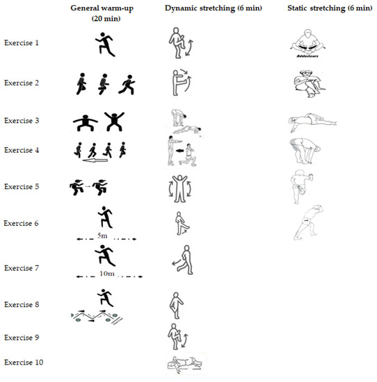 The static stretching protocol consisted of 6 min of stretching focused on the lower body and 5 min of walking. After walking at a normal pace, players performed six static stretches. For each leg, each stretch was performed twice (Table 2) [40]. Before moving on to the next leg or the next stretch, each stretch was performed for 10 s at the point of mild discomfort, followed by 5 s of relaxation.