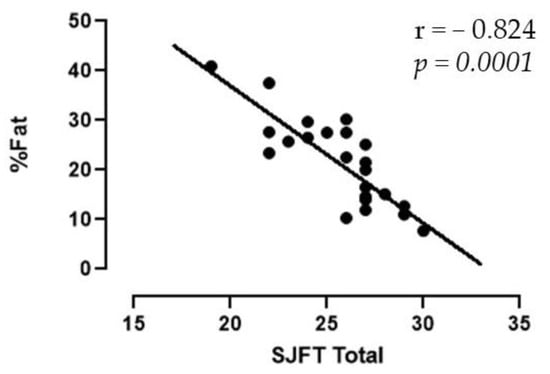 Figure 1 shows the correlation between the total fat percentage and the number of SJFT throws. The value of r was −0.824, corresponding to p = 0.0001.