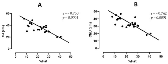 Figure 2A presents the correlation values between the SJ performance and the judo players’ total fat percentage. A value of r = −0.750 corresponds to p = 0.0001. Figure 2B shows the correlation between CMJ performance and the total fat percentage; the r value was −0.742, corresponding to p = 0.0001.