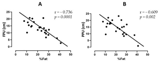 Figure 3A shows the correlation values between the FPU performance and the total fat percentage of the judo players. The value of r was −0.736, corresponding to p = 0.0001. Figure 3B shows the correlation between PPU performance and the total fat percentage; the r value was −0.609, corresponding to p = 0.002.