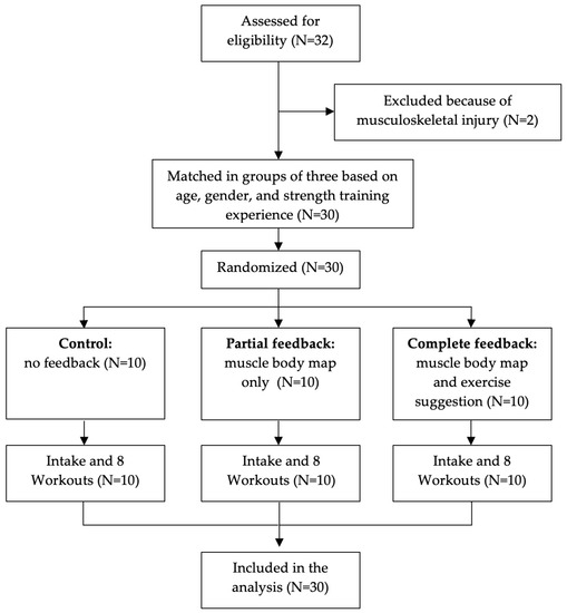 The study design was a matched experimental study with three groups. A flow diagram of the study design is shown in Figure 2. The participants were first matched by an optimization method that minimized the variations in sex, age, and strength training experience, and subsequently randomly allocated them to one of three groups: control group, ‘partial feedback’ group, and ‘complete feedback’ group. All participants started with two intake sessions with an experienced fitness instructor in which their one-repetition maximum (1RM) was estimated by a submaximal test protocol for 18 selected exercises [20]. Submaximal 1RM testing involves a safer protocol than maximal 1RM testing in which the participant performs a set of repetitions with a submaximal weight until failure. The number of correctly executed repetitions and the lifted weight are used to estimate the 1RM based on a regression equation [20]. Next, all participants performed eight strength training sessions for four consecutive weeks (two per week). In each session, the participants were instructed to perform 8 exercises of their choice from the 18 preselected exercises. All participants were instructed to attempt to perform a full-body workout, loading all muscles evenly. Performed exercises, sets, repetitions, and weights were automatically tracked by the Gymstory sensor. Based on this data in combination with the measured 1RMs and functional anatomical knowledge of primary and secondary muscle contributions per exercise, the cumulative load on each of the muscle groups for each participant was individually estimated using the developed equation (Supplementary File S2). The three groups received the following feedback regarding their muscle load during the eight workouts: