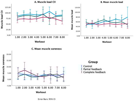 Group means of (A) the cumulative muscle load CV (coefficient of variation; indicator of muscle load balance), (B) the mean cumulative muscle load, (C) the mean muscle soreness, per workout. Error bars (95% confidence intervals (CI)) indicate the variation between participants.