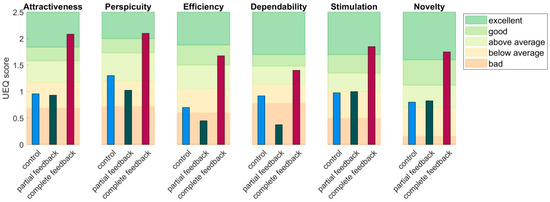 The group mean scores for the six scales of the User Experience Questionnaire (UEQ) after the last workout for all three groups are presented in Figure 4. In the background of the figure, the benchmark scores for the different scales are presented. As can be observed in this figure, the scores ranged between bad and above average for the control group and the partial feedback group, whereas the scores were above average to excellent for all scales for the complete feedback group.