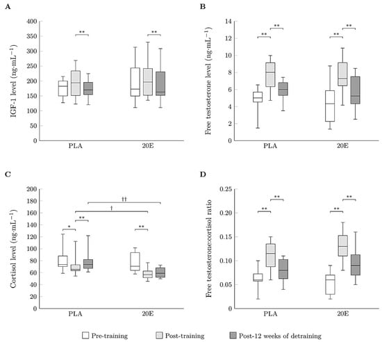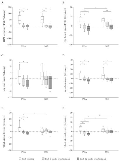 | PLA (n = 10) | 20E (n = 10) | Time Effect η2 (p-Value) | Group × Time Interaction η2 (p-Value) | |||||||