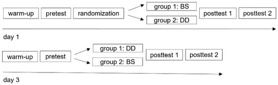 To analyze the PAPE effect magnitudes and timing from two commonly employed CA, this study used a randomized, repeated-measures design (Figure 1). All subjects were exposed to two CA in a randomized order separated by 48 h. Matched pairs of athletes based on CMJ peak power (PP) were split randomly into one of two groups. Group one completed the back squats (BS) CA on the first day (day 1) and the depth drops (DD) CA two days later (day 3), while group two did so in the reverse order.