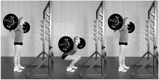 The BS CA comprised three sets of three repetitions of BS with 85% of a predicted one-repetition-maximum (1RM) and three minutes of rest between sets. Athletes were instructed to perform the concentric phase as fast as possible. Back squats were performed with feet shoulder width apart and a prescribed depth with thighs horizontal (Figure 3). One week before the study, players five-repetition-maximum load for BS was determined and used for predicting 1RM with the formula of Brzycki [] and, in turn, the individual loads used for the BS CA. There was no familiarization session because the athletes were familiar with the CA.