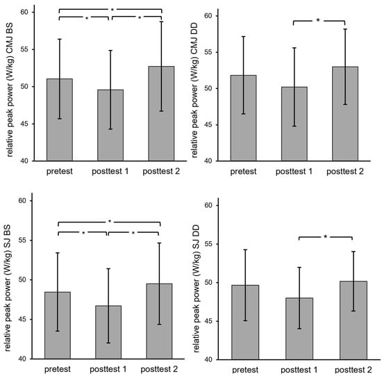 For each time point (pre-test, post-test 1, and post-test 2), PP expressed relative to the body mass (W∙kg−1) was calculated as the average of the three valid trials of both CMJ and SJ. For these values, body mass taken by the force plate in the same session was used. For each CA and time point, mean ± standard deviation was determined. After having ruled out normal distribution of the dependent variables by means of the Shapiro–Wilk test, the Friedman test was performed on both CMJ and SJ to assess the effects of CA at two post-intervention time points in a repeated-measures fashion. To assess possible main effects of time point, Conover’s post hoc tests with Holm correction were performed. Additionally, BS and DD were compared with each other by performing the Wilcoxon test on individual changes from baseline at each post-intervention time point. Statistical significance was set at p < 0.05. Furthermore, effect sizes (d) between pairs of time points were calculated as the difference in means expressed as a factor of the pooled standard deviation. Effect sizes were classified according to Cohen [] as small (≥0.2), medium (≥0.5), or large (≥0.8). Statistics were calculated using Jasp 0.14.1 Software (Jasp, University of Amsterdam, Amsterdam, The Netherlands).