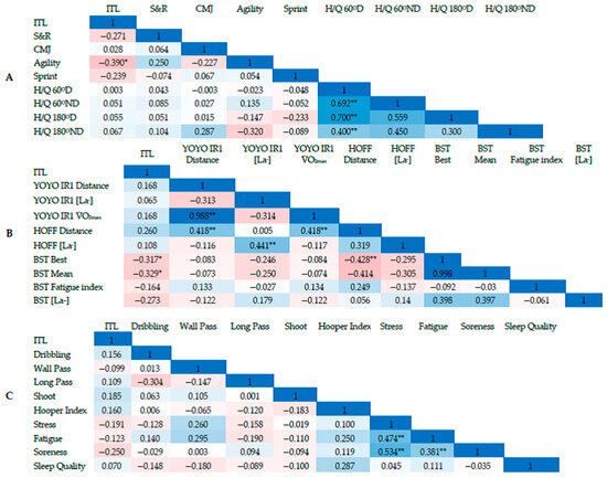 The Pearson correlation between the internal training load and (A) physical performance and isokinetic tests, (B) soccer-specific fitness tests, and (C) Soccer-specific technical skills and wellness status. The correlation magnitude of associations was reported as: trivial if r ≤ 0.1, small if r = 0.1 to 0.3, moderate if r = 0.3 to 0.5, large if r = 0.5 to 0.7, very large if r = 0.7 to 0.9, and nearly perfect if r ≥ 0.9. (** Correlation is significant at the 0.01 level; * Correlation is significant at the 0.05 level.) Legend: Blue color: direct correlation; Red color: inverse correlation; ITL: Internal training load; S&R: Sit and reach; CMJ: Counter-movement jump; Agility: Illinois agility test; Sprint: 30 m Sprint; H/Q 60°D: H/Q dominant ratios 60°·s−s; H/Q 60°ND: H/Q non-dominant ratios 60°·s−s; H/Q 180°D: H/Q dominant ratios 180°·s−s; H/Q 180°ND: H/Q non-dominant ratios 180°·s−s); YOYO IR1 Distance: YOYO IR1 distance; YOYO IR1 [La−]: YOYOIR1 Peak blood lactate; YOYO IR1, O2max: YOYO IR1 maximal oxygen uptake; HOFF Distance: Hoff test total distance; HOFF [La−]: Hoff test peak blood lactate; BST Best: Fastest Bangbo sprint test; BST Mean: Average Bangbo sprint test; BST Fatigue Index: Fatigue index of Bangbo sprint test; BST [La−]: Peak blood lactate of Bangbo sprint test); Dribbling: Slalom dribbling; Shoot: Shooting; Soreness: Muscle soreness; Sleep Quality: Sleep quality.