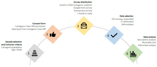A virtual recruitment was conducted by email through a database from the town hall of Cartagena. Participants provided their signed informed consent before enrollment. A dedicated Google form including the questionnaires was used to collect the data anonymously. Figure 1 shows the research process.