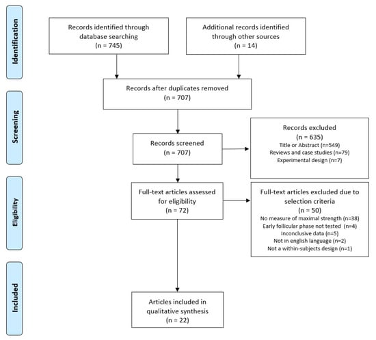 The process of the literature search is illustrated in Figure 1. The English PRISMA flow chart for systematic reviews [60] served as a template. The search yielded a total of 745 hits as well as 14 additional hits through a manual search of reference lists. After removing duplicates and excluding articles based on title or abstract as well as reviews, case studies, and articles with experimental study designs, 707 studies remained. Accordingly, seventy-two articles were subjected to a full-text search; of these articles, thirty-eight did not report a measurement of maximal strength, four did not test in the early follicular phase, five provided inclusive data, two were not written in English, and one did not use a within-subjects design.