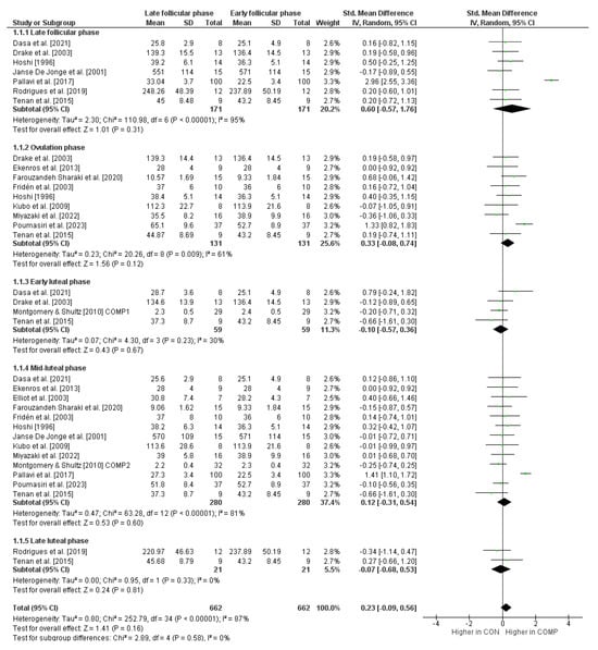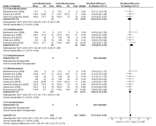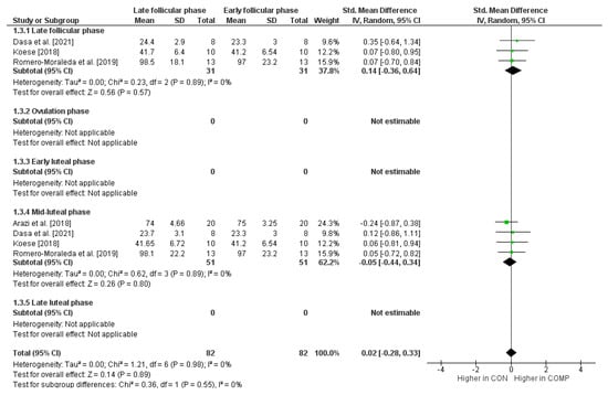 The data were analyzed using Cochrane’s Review Manager 5.4.1. To identify differences in different cycle phases, a subgroup analysis was conducted. A subgroup was created if at least three measurements were available for a cycle phase. In each subgroup analysis, the early follicular phase served as a control condition and was compared to another phase (i.e., comparator condition). The standardized mean difference (SMD) was calculated to assess differences between the control condition and the comparator conditions. A positive/negative SMD value indicates better maximal strength performance for the comparator/control condition. Further, and in accordance with Cohen [68], SMD values of 0 ≤ 0.49 indicate small effects, values of 0.50 ≤ 0.79 indicate medium effects, and values of ≥0.80 indicate large effects. I2 statistics were assessed according to the ranges given by Deeks et al. [69]. These are defined as 0–40%: trivial heterogeneity, 30–60%: moderate heterogeneity, 50–90%: substantial heterogeneity, and 75–100%: considerable heterogeneity. It is emphasized here that the assessment of the I2 statistics should not be used solely to make a statement about heterogeneity. The ranges of values given serve as a rough classification [70].