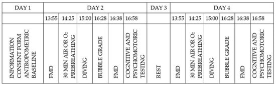 Experimental protocol showing activities of the divers in the study and indicating diving on day 2 and day 4. Prebreathing of air and oxygen was randomly assigned.