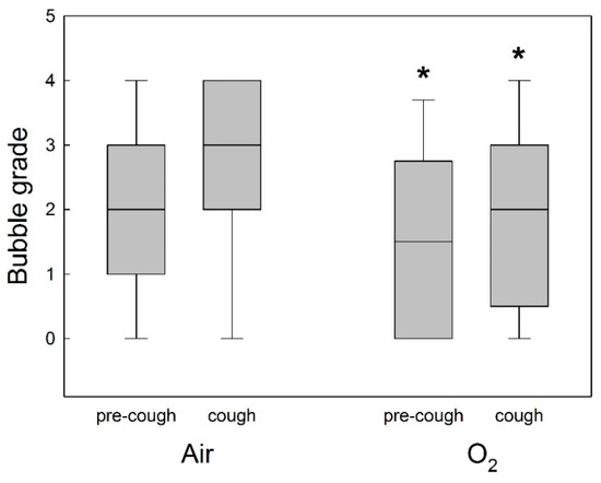 Post-dive circulating bubble detection for all divers after air or oxygen (O2) prebreathing in all experimental conditions (before or after a cough). Data are presented as medians (horizontal lines), 25th and 75th quartiles (shaded squared areas), and 10th and 90th percentile ranges (error bars) of the venous bubble grades measured after the dives. * Significant difference in bubble grade in O2 prebreathing protocol compared to air prebreathing protocol (p < 0.05).