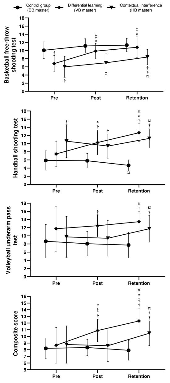 Mean ± SD of the basketball free-throw, handball shooting, the volleyball underarm pass tests, and the composite score for control, contextual interference, and differential learning groups at pre-, post-, and retention test timepoints. *: significantly different compared to pre; ¤: significantly different compared to post; †: significantly different compared to the control group; ‡: significantly different compared to contextual interference.