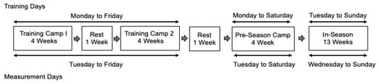 Fifty collegiate American football athletes participated during their 27-week season consisting of two 4-week summer camps, each separated by a week of rest, one 4-week pre-season camp and a 13-week in-season (see Figure 1). The exercise training sessions lasted, on average, 161.1 (±40.6) min and ranged from 90.1 to 339.6 min. Although the intensity and exercises performed varied within and between training sessions, all athletes were exposed to the same training. All training occurred during football practices and incorporated strength- and power-focused resistive exercises, short-distance sprint intervals, aerobic training and agility training.