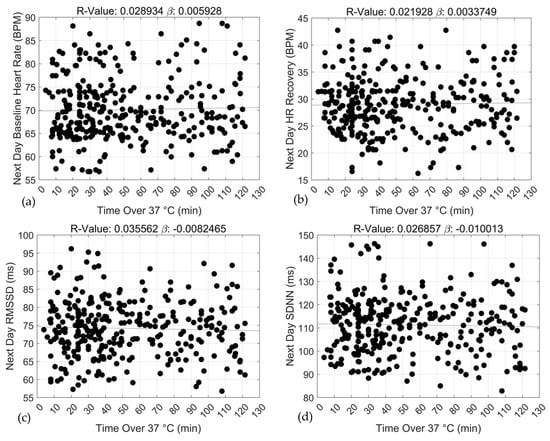 Associations between exercise training duration (min) and 24 h baseline heart rate (a), 24 h heart rate recovery (b), 24 h rMSSD (c) and 24 h SDNN (d) over the ≥37 °C threshold.