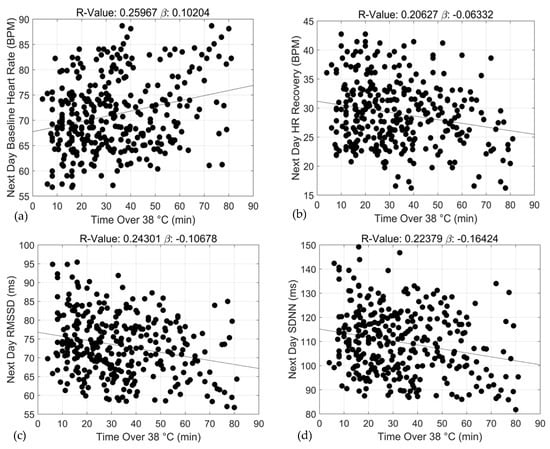 Associations between exercise training duration (min) and 24 h baseline heart rate (a), 24 h heart rate recovery (b), 24 h rMSSD (c) and 24 h SDNN (d) over the ≥38 °C threshold.