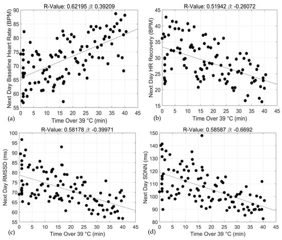 Associations between exercise training duration (min) and 24 h baseline heart rate (a), 24 h heart rate recovery (b), 24 h rMSSD (c) and 24 h SDNN (d) over the ≥39 °C threshold.