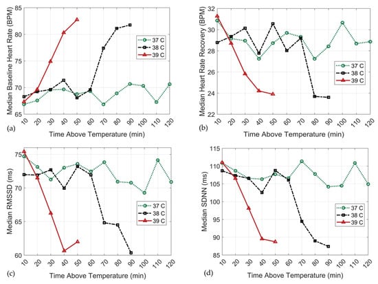 Our study also found that the influence of training duration on ANS deterioration is augmented at higher core temperatures and the “time to” ANS deterioration is accelerated. The strength of the associations between training duration and ANS recovery and function strengthens with increases in core temperature. Specifically, at the ≥39 °C threshold, we observed a larger magnitude of this association for baseline HR, HR recovery, rMSSD and SDNN (R2 = 0.62 vs. 0.26, 0.52 vs. 0.21, 0.58 vs. 0.24 and 0.59 vs. 0.22, respectively). Additionally, we observed a steeper slope between duration and 24 h ANS recovery and function when core temperature increased from the ≥38 °C threshold to ≥39.0 °C (baseline HR: β = 0.10 vs. 0.39, HR recovery: β = −0.06 vs. −0.26, rMSSD: β=−0.11 vs. −0.37 and SDNN: β = −0.16 vs. −0.67). This finding suggests that as core temperatures increase beyond 38 °C, ANS deterioration is accelerated. The precipitous deterioration of the ANS following exposure to increasing hyperthermic temperatures is well-established [,,]. Former studies show that sport performance, even at the elite level, significantly declines at very high core temperatures (40.0 °C–41.5 °C) despite adequate heat acclimatization and pre-, during- and post-competition cooling strategies [,]. These studies reported varying degrees of dehydration, extreme central and peripheral fatigue, reduced motor function, etc., throughout and immediately post competition. Given the findings of the current study, we speculate that those elite athletes likely experienced some degree of ANS dysfunction 24 h later, but it was not measured. Relatedly, our study also showed that 24 h ANS deterioration may occur following shorter bouts of training in the high heat than at sub-hyperthermic core temperatures. For example, in Figure 5, ANS recovery (baseline HR) degradation under the ≥39.0 °C threshold was initiated following only a 10 min bout of training, whereas under the ≥38.0 °C threshold a 60 min exposure was required to elicit ANS degradation. Similarly, deterioration of ANS function (HR recovery, rMSSD and SDNN) followed 10 min and 70 min exposures under the ≥39.0 °C and ≥38.0 °C thresholds, respectively. This indicates that at elevated core temperatures, a longer duration may be required to induce the same level of ANS dysfunction, and vice versa for training under higher core temperatures. This finding further emphasizes the importance of coaches monitoring both core temperature and duration throughout training, as the physiological load amplifies with parallel increases in temperature. The increased physiological load consequent to higher core temperature, however, is deteriorative due to the body working against the heat and not towards improved performance. Core temperature increases rapidly at the onset of exercise due to higher ATP production and hydrolysis. In hot and humid climates, core temperature fails to reach a steady state, continuing to climb until the heat exposure is removed (e.g., cooling intervention) []. Without monitoring, an athlete may quickly surpass a core temperature of 38.0 °C and 39.0 °C without acute and observable effects of ANS deterioration.
