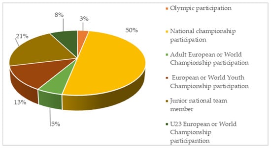 To further understand the sample, rowers were asked to indicate the most prestigious race by rowers in their sport life so far. They could choose from the following: I was an Olympic participant; I competed in a national championship; I was an adult European or World Championship participant; I was a European or World Youth Champion; I am a member of the junior national team; I was a U23 European or World Championship participant. Respondents could only select 1 option, which was considered their best sporting result (Figure 1).