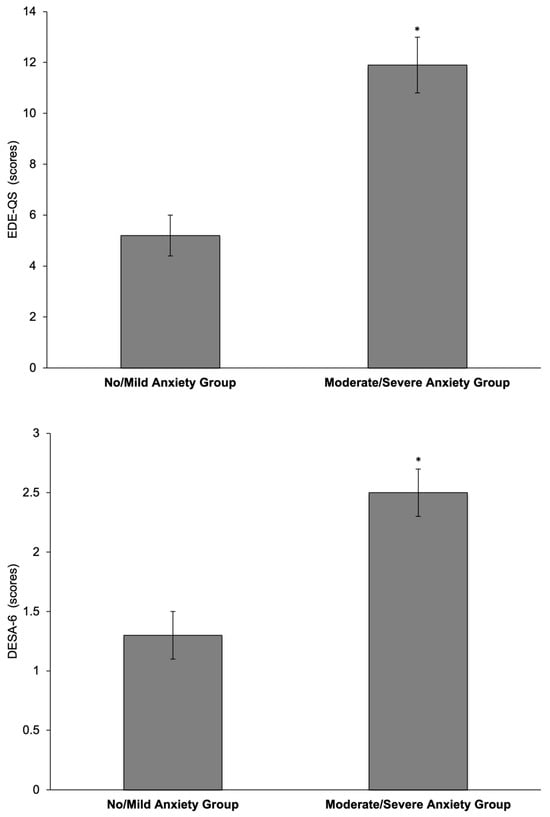 Scores indicating the risk of eating disorders (EDE-QS) and the risk of disordered eating (DESA-6) in female athletes with no/mild anxiety (n = 55) and moderate/severe anxiety (n = 60). * p = <0.001 when comparing groups. Data are reported as mean ± SEM. EDE-QS = Eating Disorder Examination Questionnaire-Short, DESA-6 = Disordered Eating Screen for Athletes.