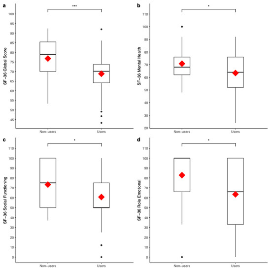 Box plots representing the mean (in red) of general health-related scores obtained by subjects who reported supplements and/or other substance consumption versus subjects who reported not consuming supplements and/or other substances. The SF-36 global score was compared between the two groups (a), as well as the following domains: mental health (b), social functioning (c), and role emotional (d). * = p < 0.05, *** = p < 0.001.