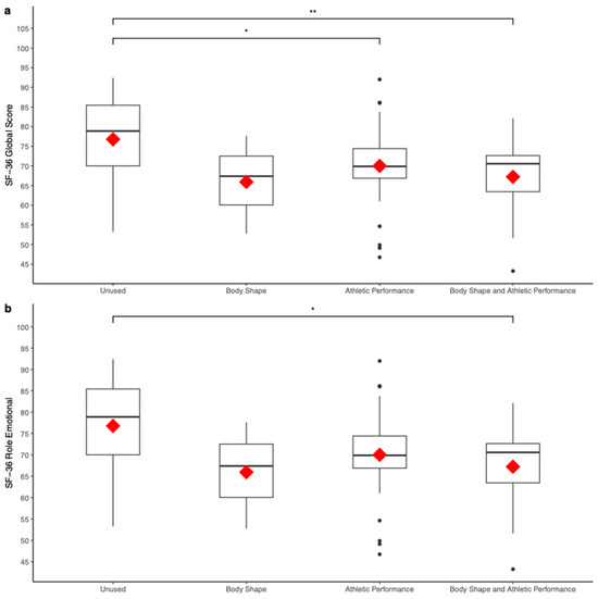One-way ANCOVAs were conducted to compare the general health-related mean scores obtained by the subjects according to their self-reported motivations behind supplements and/or other substance intake, controlling for age. After adjusting for age, a statistically significant difference was detected in SF36 global scores between the groups (Group (Unused): 76.77 ± 10.60; Group (Body Shape): 65.92 ± 12.50; Group (Athletic Performance): 70.01 ± 10.42; Group (Body Shape and Athletic Performance): 67.22 ± 9.82; F(3,87) = 3.21, p < 0.05, η2 = 0.10; see Figure 2a). Pairwise comparisons of estimated marginal means highlighted a statistically significant difference between the scores obtained by subjects who do not use supplements and the scores of those who use supplements to affect athletic performance (p < 0.05, d = 0.64). Pairwise comparisons of estimated marginal means also highlighted a statistically significant difference between the scores obtained by subjects who do not use supplements and the scores of those who use supplements to affect body shape and athletic performance (p < 0.01, d = 0.93). A statistically significant difference was also detected in SF36 role emotional sub-scale between the groups (Group (Unused): 82.79 ± 30.57; Group (Body Shape): 44.33 ± 50.95; Group (Athletic Performance): 71.75 ± 38.95; Group (Body Shape and Athletic Performance): 51.61 ± 39.93; F(3,87) = 2.99, p < 0.05, η2 = 0.10; see Figure 2b). Pairwise comparisons of estimated marginal means highlighted a statistically significant difference between the mean scores obtained by subjects who do not use supplements and the scores of those who use supplements to affect body shape and athletic performance (p < 0.05, d = 0.87).