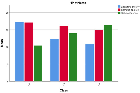 Concerning hypothesis H4, comparisons between athletes of different classes showed significant differences in years of experience, perceived preparedness, cognitive anxiety, and self-confidence. Specifically, B-class athletes had more years of experience than C-class and D-class athletes, while C-class athletes had more experience than D-class athletes, suggesting a gradual increase in experience with progression through classes. Regarding perceived preparedness, no substantial differences were found between C-class and B-class athletes or between D-class and C-class athletes, but a notable difference emerged between D-class and B-class athletes, with D-class athletes perceiving themselves as less prepared than their more experienced counterparts. Regarding levels of cognitive anxiety, C-class athletes experienced higher levels compared to B-class, followed by D-class, though the difference was not significant. B-class athletes showed lower levels of cognitive anxiety, possibly due to the more established environment, where athletes had demonstrated competitive ability. Finally, in terms of self-confidence, B-class athletes exhibited higher self-confidence than D-class athletes. Accumulated experience in the B-class likely contributed to more developed skills, opportunities to overcome challenges, and positive results [39]. Somatic anxiety levels, however, did not appear to vary by class, suggesting that somatic anxiety may be a common physiological response among athletes regardless of competitive level.