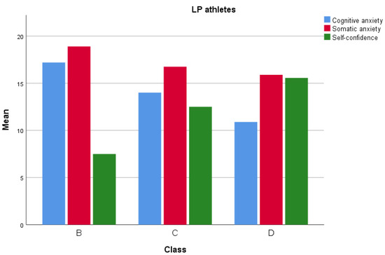From the two-way Anova, the performance level variable had a significant effect on self-confidence, as did the class variable and the interaction between class * performance level. From the post hoc Bonferroni, significant differences emerged between B–C and B–D (p = 0.00). The performance level variable had a significant effect on somatic anxiety, but the class variable did not have a significant effect. Additionally, there was no evidence of a significant interaction between class * performance level on somatic anxiety (p > 0.05). The performance level variable had a significant effect on cognitive anxiety, as did the class variable and the interaction between class * performance level. From Bonferroni, a significant difference emerged between B and C classes (p = 0.00). A detailed description is shown in Table 6.