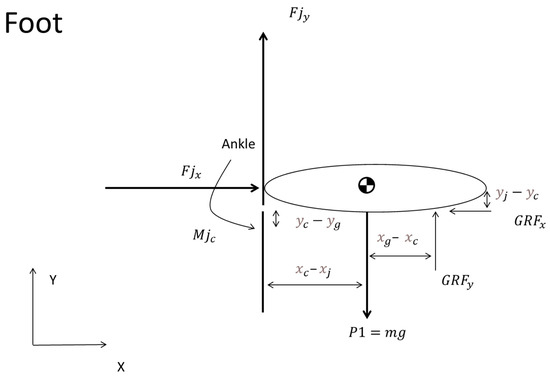 The forces and represent the joint forces in the horizontal and vertical directions, respectively, (8) and (9). In Equation (10), denotes the joint moment. Concurrently, and correspond to the ground reaction forces (GRFs) in the horizontal and vertical planes. P1 is the foot weight, computed as the product of the mass of the foot and the gravitational acceleration [36].