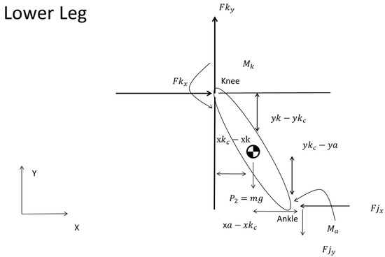Starting with Equation (11), represents the horizontal force at the knee joint and in Equation (12), is the vertical component.