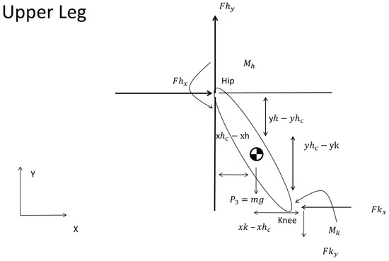In the same manner, Equation (16) defined the moment equilibrium about the hip joint. and are the moments at the knee and hip about the CoM of the femur (Figure 8). The coordinates and specify the CoM of the femur. Meanwhile, and pinpoint the locations of the hip and knee (Figure 8).