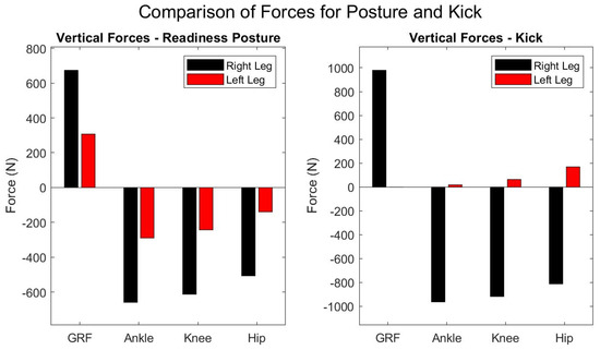 Vertical forces on lower extremity joints during “readiness” static posture and kick posture highlight differences in force distribution between the right and left legs. Since the vertical forces were calculated, it is clear that the reactions will have opposite signs. As the weight of each segment is subtracted, the vertical force progressively decreases from the foot up to the hip.