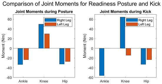 Joint moments at the ankle, knee, and hip for “readiness” posture (left) and kick posture (right). Positive moments indicate counterclockwise rotation, and negative moments indicate clockwise rotation.