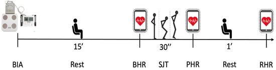 Study design and timeline. BIA: bioimpedance analysis; BHR: baseline heart rate; SJT: squat jump test; PHR: peak heart rate; RHR: resting heart rate.